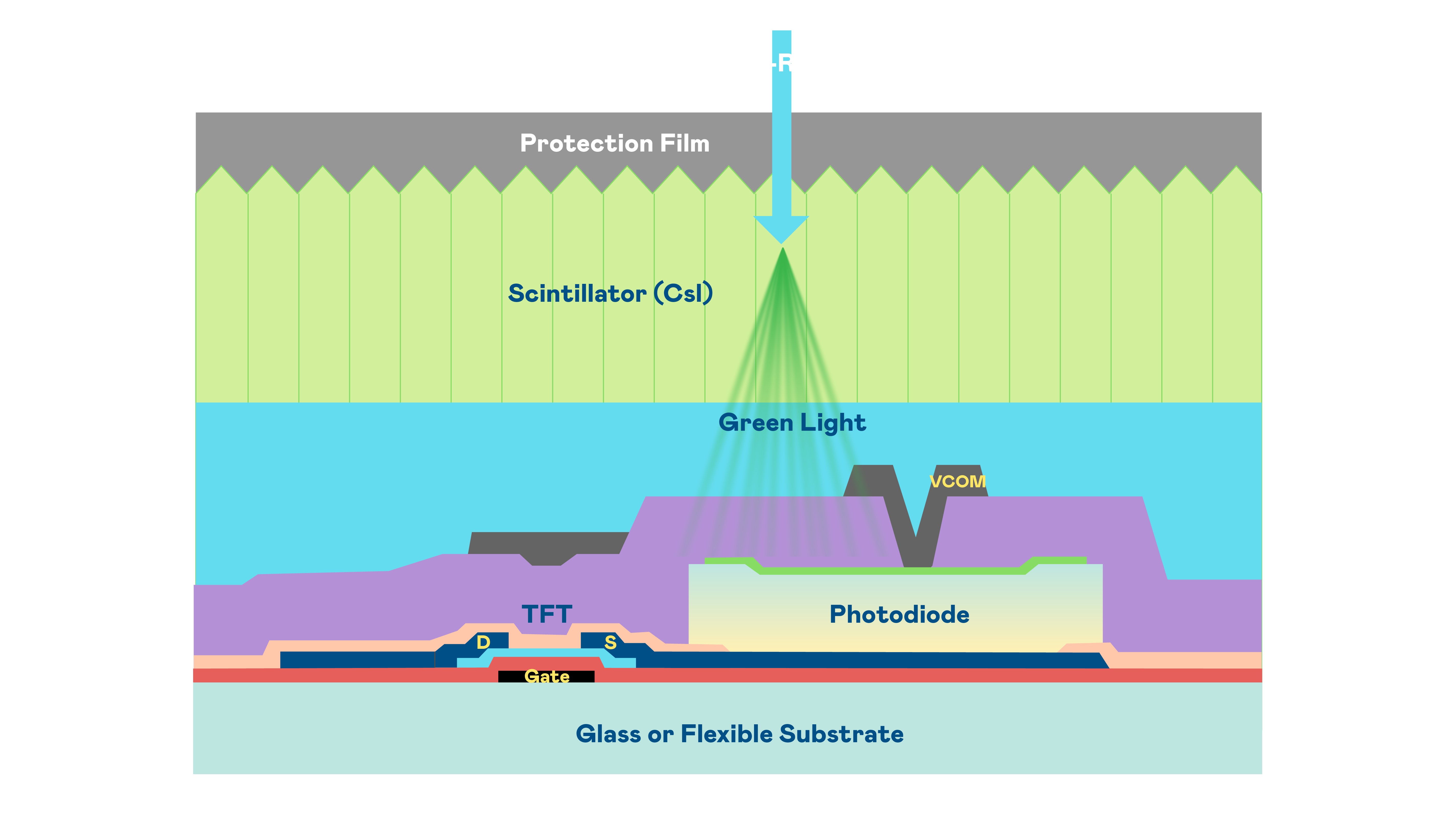 713贵宾会的X光影像感测阵列使用薄膜电晶体 (TFT) 作为每个像素的读取开关,搭配光电二极体(Photodiode)的光电转换元件,用以感测X光影像讯号。